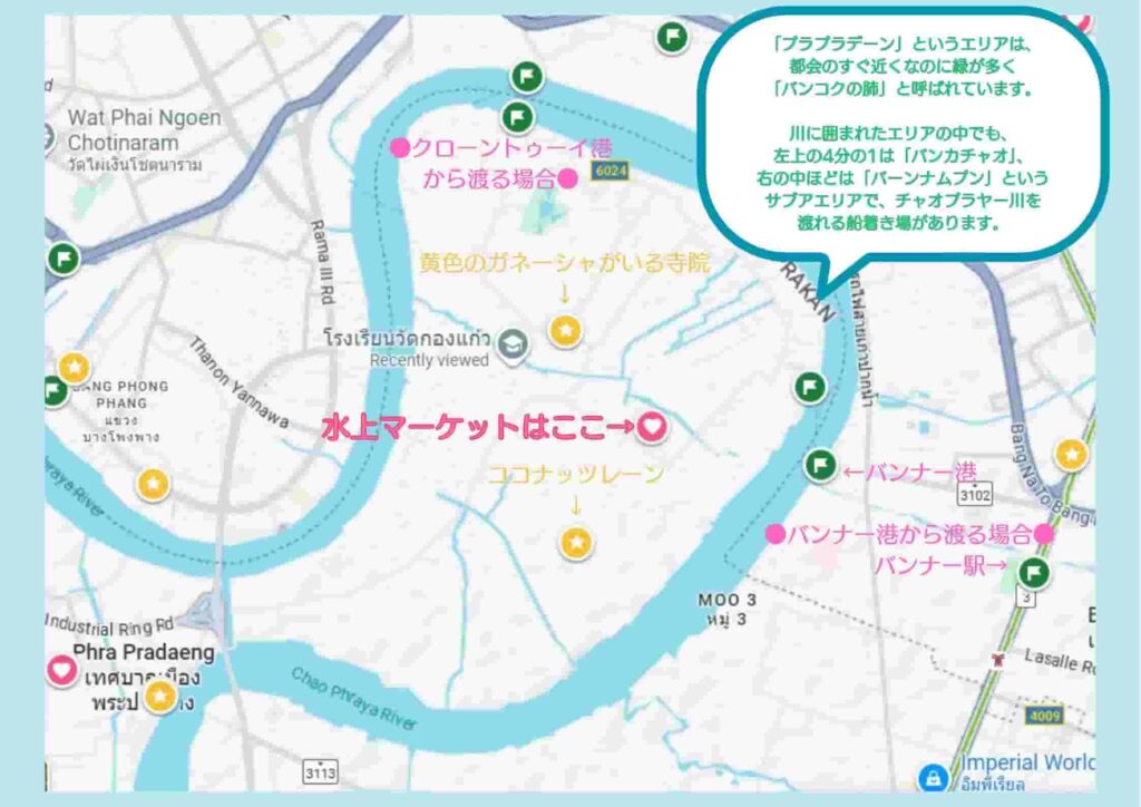 本記事でご紹介するバーンナムプン水上マーケットは、チャオプラヤー川が大きく湾曲して島のようになった場所(以降、便宜上「島」と呼びます)を包括するプラプラデーン(タイ人が発音するとパパデーンと聞こえる)という、まさに「バンコクの肺」にあたるエリアにあります。