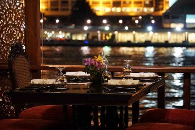 テラス席で川沿いの夜景を眺めながら過ごす時間は、バンコクの中でも特に贅沢なひとときです。