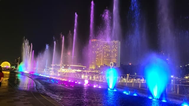 カラフルなライトと音楽に合わせて噴水が踊るように動き、幻想的な雰囲気。