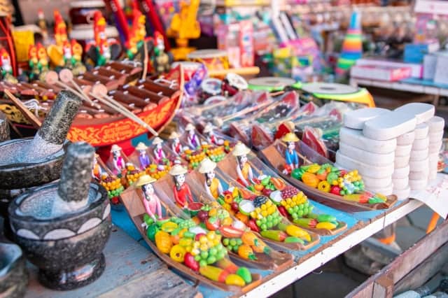 小舟の上で作られるタイ料理や、地方の特産品が並んでいて、旅行気分がぐっと盛り上がります。