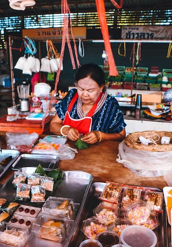 市場ではタイのお菓子や果物、雑貨も買えるので、ちょっとしたお土産探しにもぴったりです。